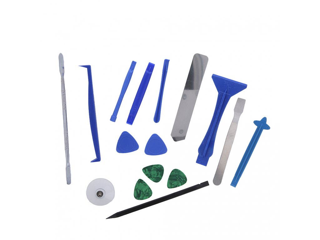 Sada 16 nástrojů pro otevírání všech typů elektronických zařízení, která obsahuje: