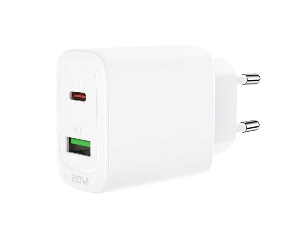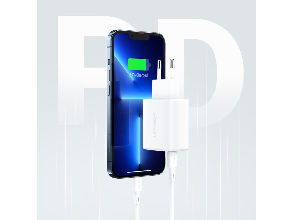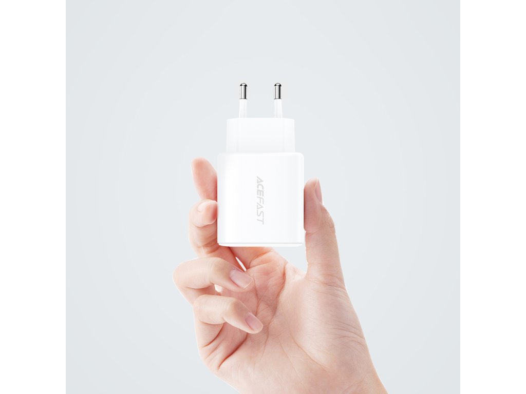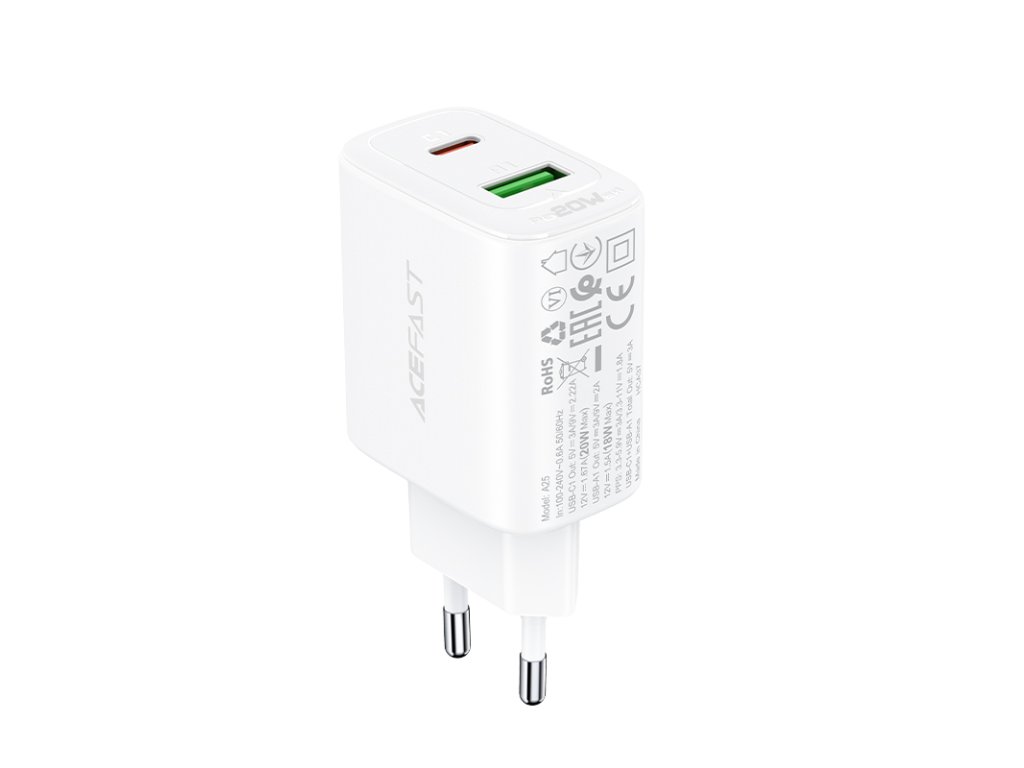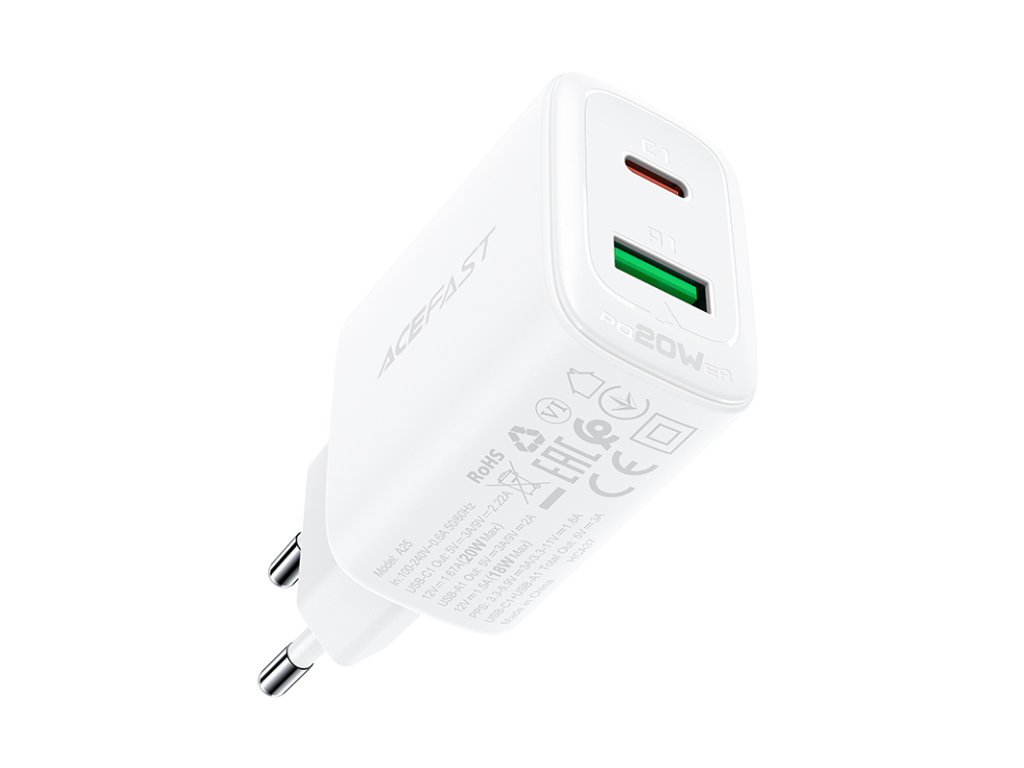 Acefast A25 rychlá nabíječka / USB-C + USB-A / 20W / PPS / PD / QC 3.0 / FCP / AFC / bílá.