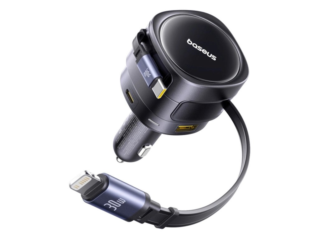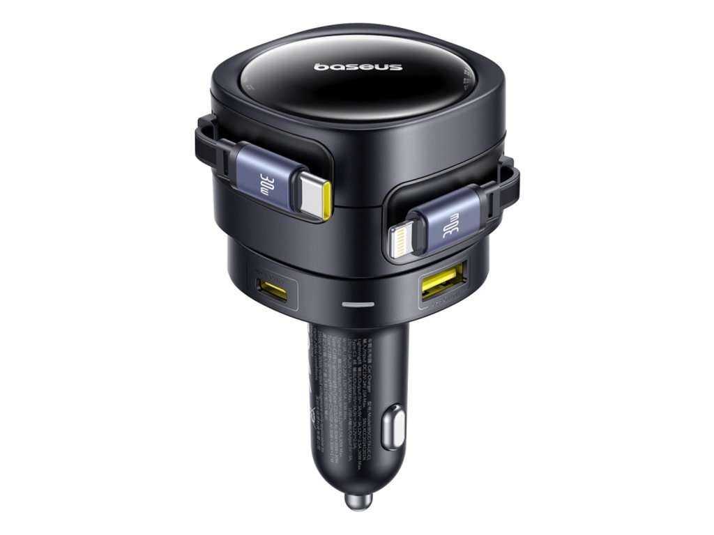 Baseus Enjoyment Max 90W je efektivní autonabíječka, která umožňuje nabíjet až čtyři zařízení současně. Má dva integrované kabely (USB-C a Apple Lightning), které vycházejí z opačných stran těla, a dva další porty: USB-C a USB-A. Každý výstup podporuje rychlé nabíjení v oblíbených standardech - PD, QC, SCP a AFC - a celkový výkon sady dosahuje 90W.