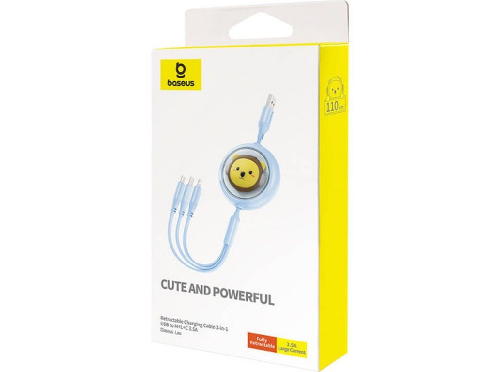 Zatahovací kabel Baseus Leo USB-A s maximální délkou 110 cm je univerzálním příslušenstvím pro uživatele zařízení od různých výrobců s různými nabíjecími koncovkami. Je vybaven třemi vestavěnými konektory: USB-C, Lightning a Micro USB.