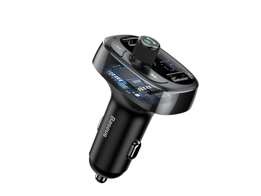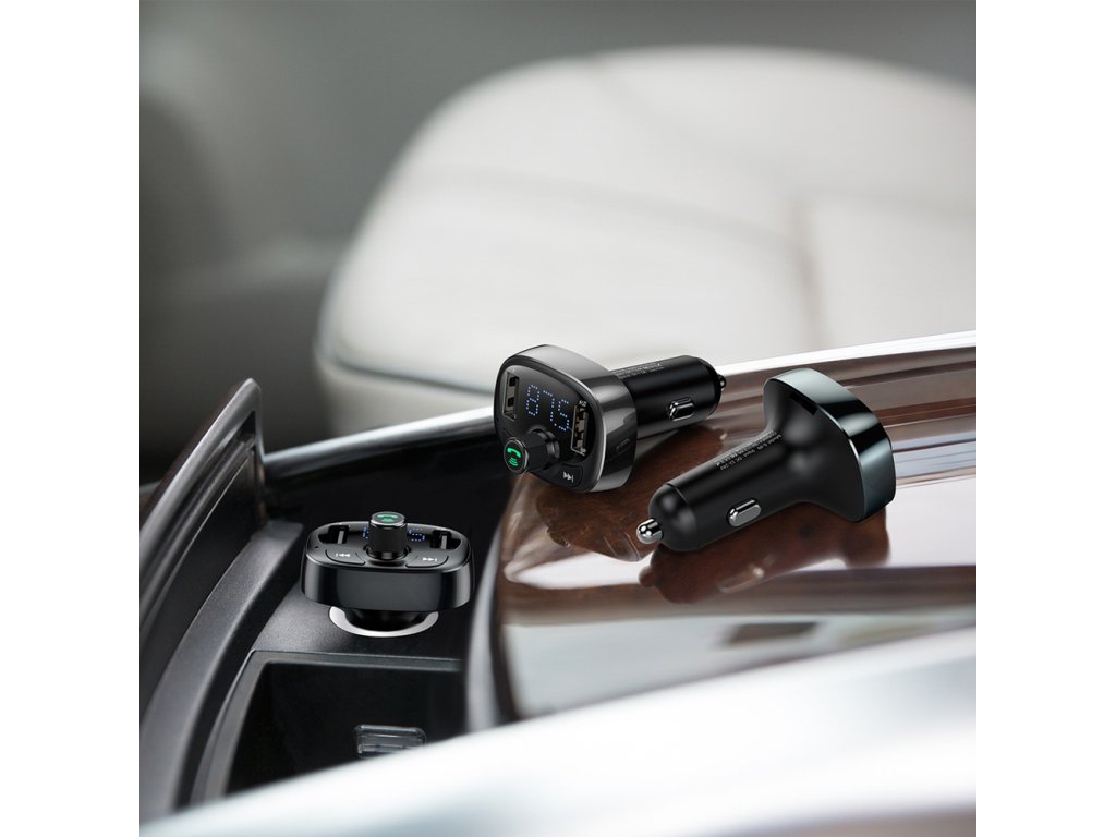 FM vysílač Baseus S-09 je multifunkční zařízení, které kombinuje Bluetooth vysílač, MP3 přehrávač a nabíječku do auta. Umožňuje bezdrátově přehrávat hudbu z telefonu, flash disku nebo microSD karty a také telefonovat handsfree. Vestavěný mikrofon zajišťuje čistý zvuk a dva porty USB-A umožňují současné nabíjení mobilních zařízení. Digitální LED displej zobrazuje napětí baterie a FM frekvenci. Stylové, lesklé tělo a kompaktní rozměry dělají z modelu S-09 perfektní volbu pro interiér jakéhokoli auta.