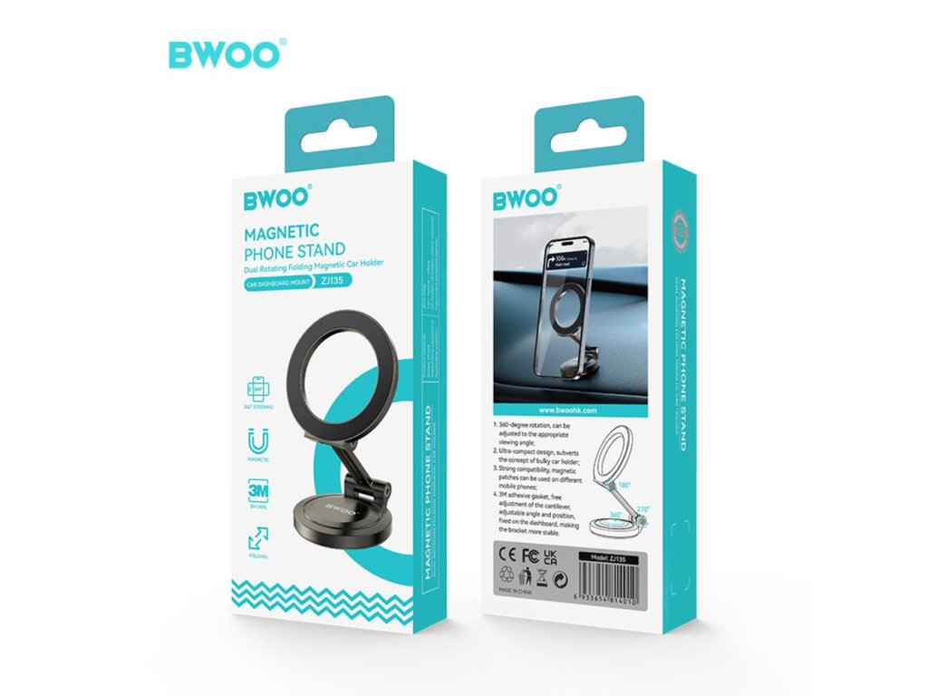 Držák do auta BWOO BO-ZJ135 je praktické a elegantní řešení pro bezpečné používání telefonu během jízdy. Je vybaven silnými neodymovými magnety, které zajišťují mimořádně pevné uchycení telefonu, takže zůstane stabilně na svém místě i při jízdě po nerovných silnicích.