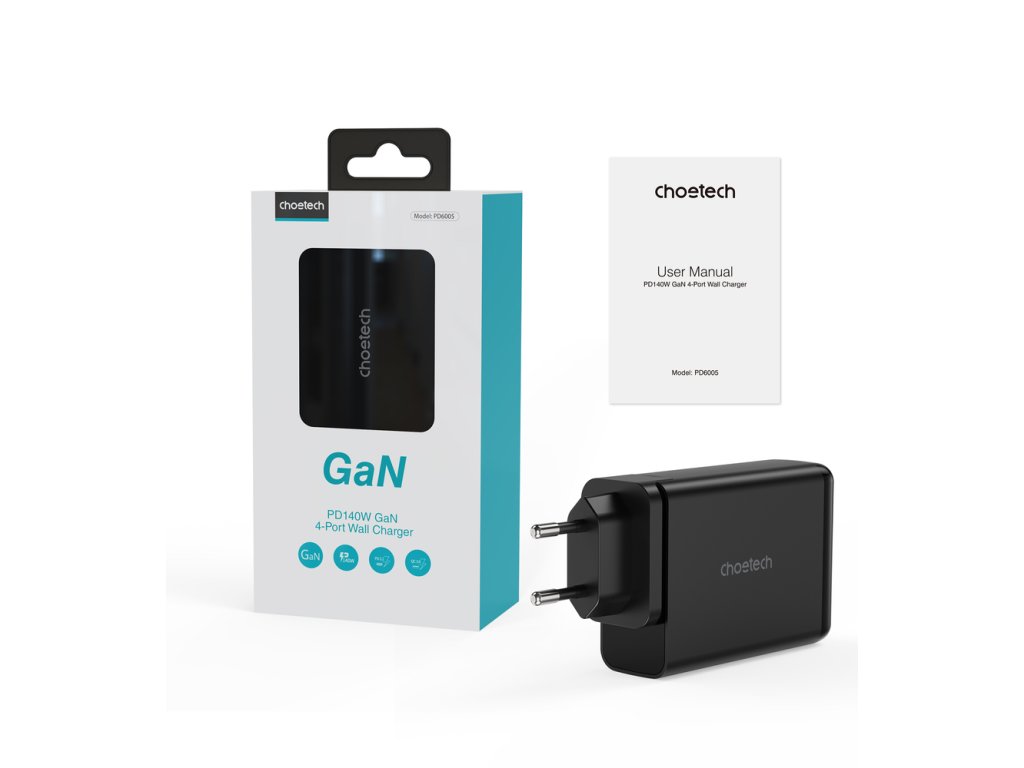 Choetech PD6005 rychlá nabíječka / 2x USB-C / 2x USB-A / 140W / GaN - černá.