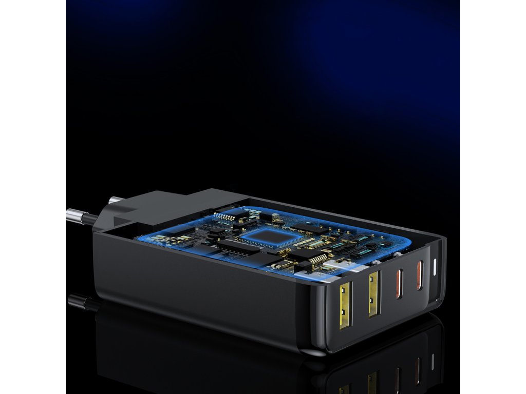 Technologie GaN umožňuje dosáhnout vysokého výkonu při zachování kompaktních rozměrů, nižší spotřeby energie a vysoké efektivity nabíjení. Nabíječka je vybavena čtyřmi výstupními porty, takže můžete současně nabíjet až čtyři zařízení.