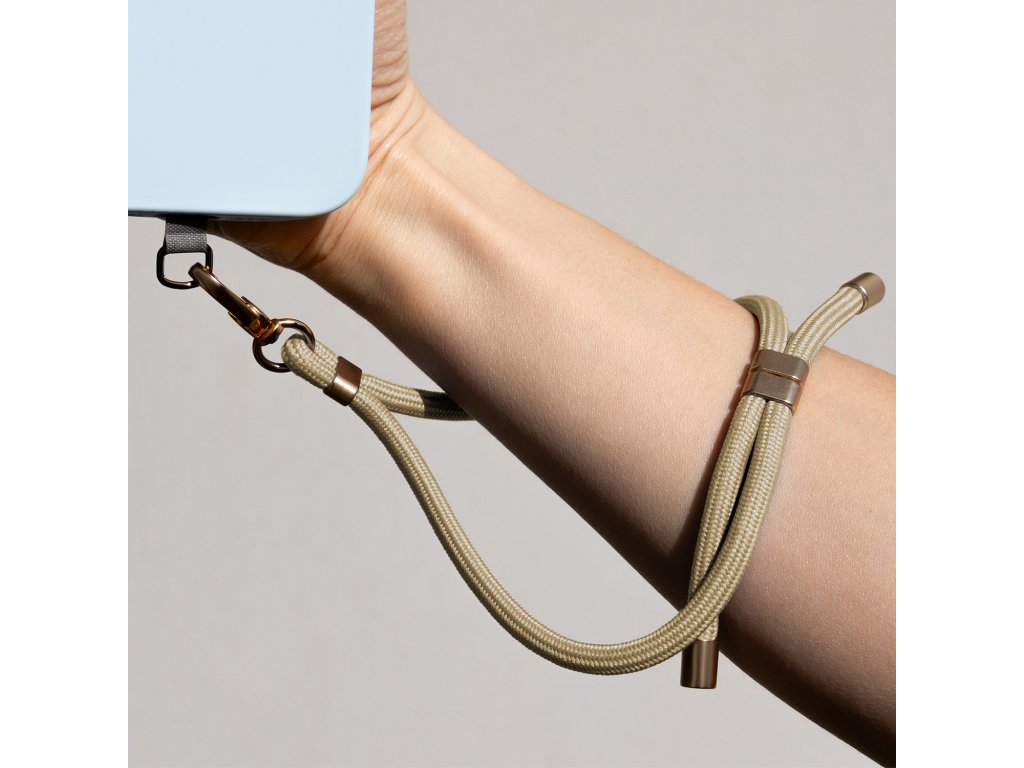 Univerzální šňůrka na zápěstí je praktický způsob, jak nosit telefon, klíče nebo jiné drobné příslušenství, které budete mít vždy po ruce. 6mm silná opletená šňůrka v kombinaci se zlatými detaily dodává poutku moderní a elegantní vzhled, zatímco zlatá kovová karabina umožňuje snadné připevnění k pouzdru, batohu nebo klíčence.