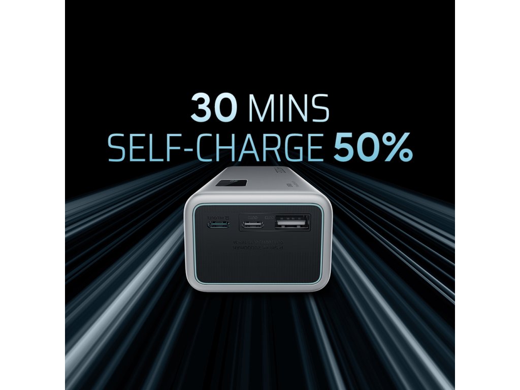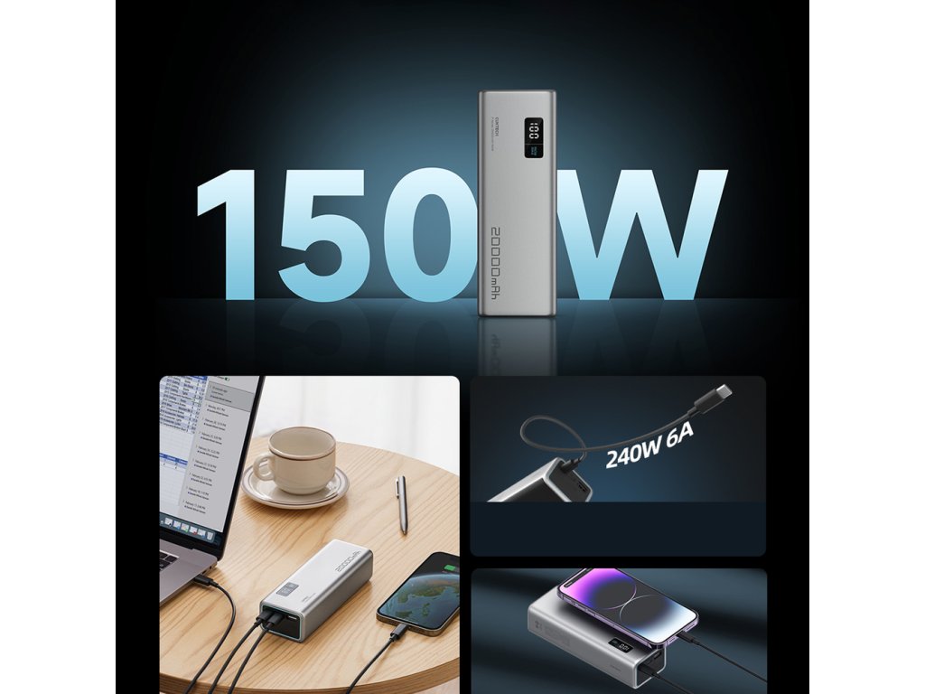Powerbanka umožňuje nabíjení výkonem až 120W při použití jednoho portu, což zajišťuje rychlé doplnění energie i u zařízení s vysokou spotřebou. Při využití více portů dosahuje celkový výstupní výkon až 150W, takže můžete pohodlně nabíjet několik zařízení současně.