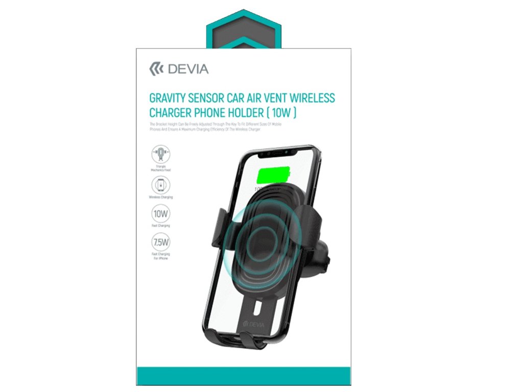 Devia EA194 gravitační držák mobilu do auta s nabíjením 10W, do mřížky ventilátoru - černý.