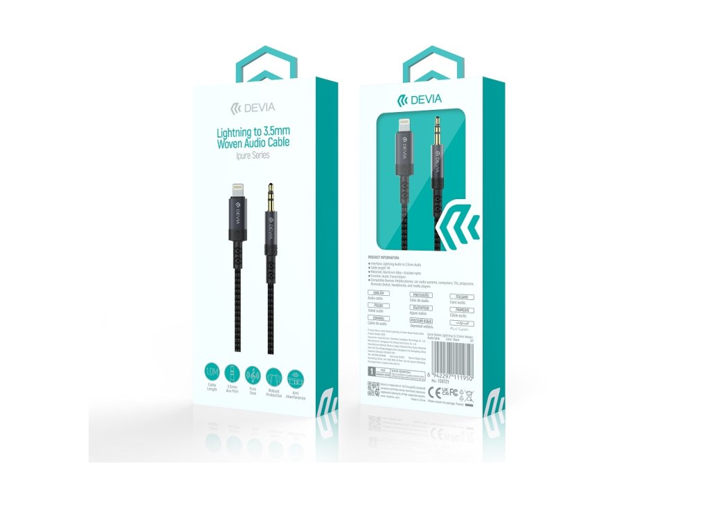 Devia Ipure EC619 je univerzální audio kabel pro zařízení vybavená 3,5mm jack zdířkaou a Apple Lightning konektorem. Umožní vám propojit zařízení s Apple Lightning konektorem k autorádiu, reproduktorům nebo jinému zařízení vybavenému 3,5mm jack zdířkou. Nylonový oplet je pevný a zvyšuje životnost.