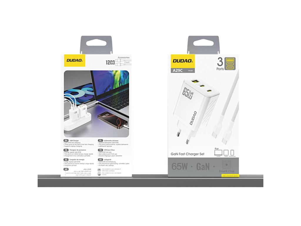 Dudao A29C je pokročilá nástěnná nabíječka s technologií GaN, která nabízí výkon až 65W a podporuje rychlé nabíjení PD a QC. Je vybavena třemi porty (2x USB-C a 1x USB-A) a umožňuje vám současně nabíjet více zařízení – od chytrých telefonů a tabletů až po notebooky. Integrovaný čip eMarker zajišťuje stabilitu a zabezpečení a chrání připojená zařízení. Sada obsahuje 1m kabel USB-C na USB-C, který podporuje rychlé nabíjení a přenos dat.