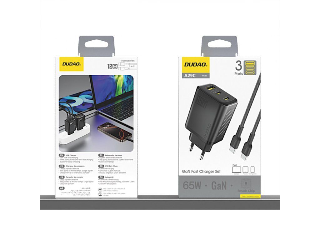 Dudao A29C je pokročilá nástěnná nabíječka s technologií GaN, která nabízí výkon až 65W a podporuje rychlé nabíjení PD a QC. Je vybavena třemi porty (2x USB-C a 1x USB-A) a umožňuje vám současně nabíjet více zařízení – od chytrých telefonů a tabletů až po notebooky. Integrovaný čip eMarker zajišťuje stabilitu a zabezpečení a chrání připojená zařízení. Sada obsahuje 1m kabel USB-C na USB-C, který podporuje rychlé nabíjení a přenos dat.
