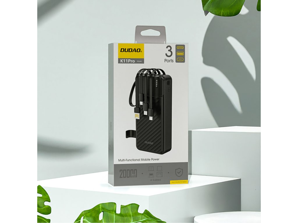 Dudao K11 Pro je praktická powerbanka s kapacitou 20 000 mAh, která kombinuje vysokou účinnost a všestrannost. Díky třem vestavěným kabelům (USB-C, Lightning a micro USB) a portu USB-A vám umožní nabíjet většinu zařízení bez nutnosti nosit další kabely. Díky štíhlému a kompaktnímu designu je ideální pro každodenní použití a cestování. Powerbanka je vybavena bezpečnostním systémem, který chrání zařízení před přehřátím, přetížením a zkratem a zajišťuje tak bezpečné a stabilní nabíjení.