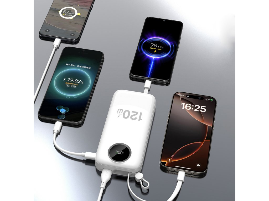 Vestavěné kabely USB-C a Lightning, další porty USB-C a USB-A a možnost nabíjení až 4 zařízení současně z ní činí mimořádně praktickou. Digitální LED displej neustále zobrazuje úroveň nabití a výkon nabíjení, zatímco bezpečnostní systém chrání před zkratem a přehřátím.