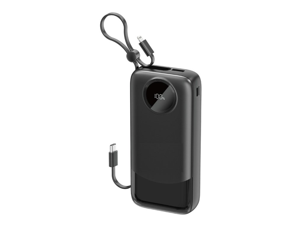 Vestavěné kabely USB-C a Lightning, další porty USB-C a USB-A a možnost nabíjení až 4 zařízení současně z ní činí mimořádně praktickou. Digitální LED displej neustále zobrazuje úroveň nabití a výkon nabíjení, zatímco bezpečnostní systém chrání před zkratem a přehřátím.