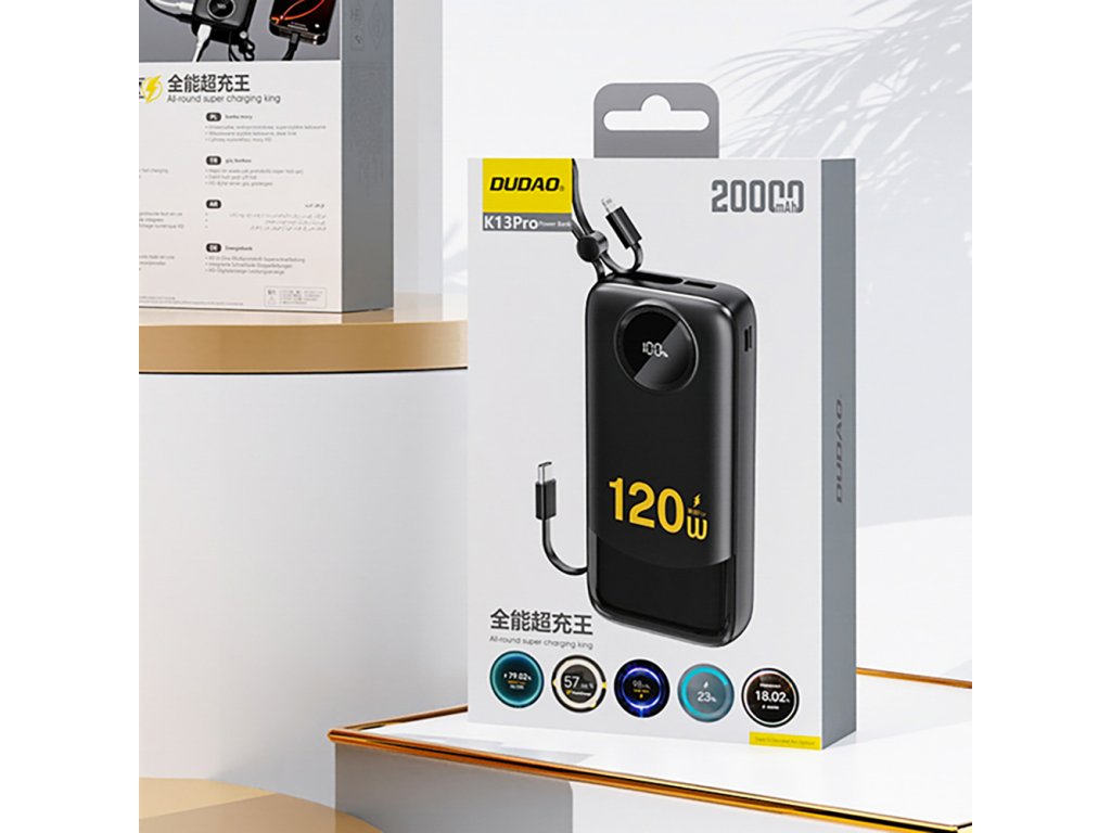 Powerbanka Dudao K13Pro s kapacitou 20000 mAh je kompaktní powerbanka, která nabízí rychlé a bezpečné nabíjení za všech podmínek. Podporuje několik protokolů rychlého nabíjení, včetně QC2.0/QC3.0, FCP, AFC, SCP, PD2.0/PD3.0 a PPS, díky čemuž je kompatibilní se zařízeními značek jako Xiaomi, Huawei, Oppo, Samsung a Apple.