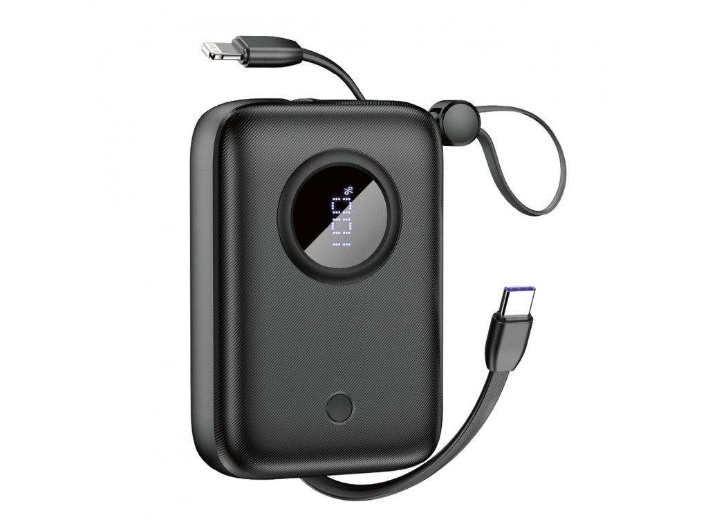 Powerbanka Dudao K14 s vestavěnými kabely USB-C a Apple Lightning. Praktické utahovací poutko umožňuje zavěšení a malé konstrukční rozměry snadný transport a přenášení. LED displej zobrazující kapacitu baterie Powerbanky.