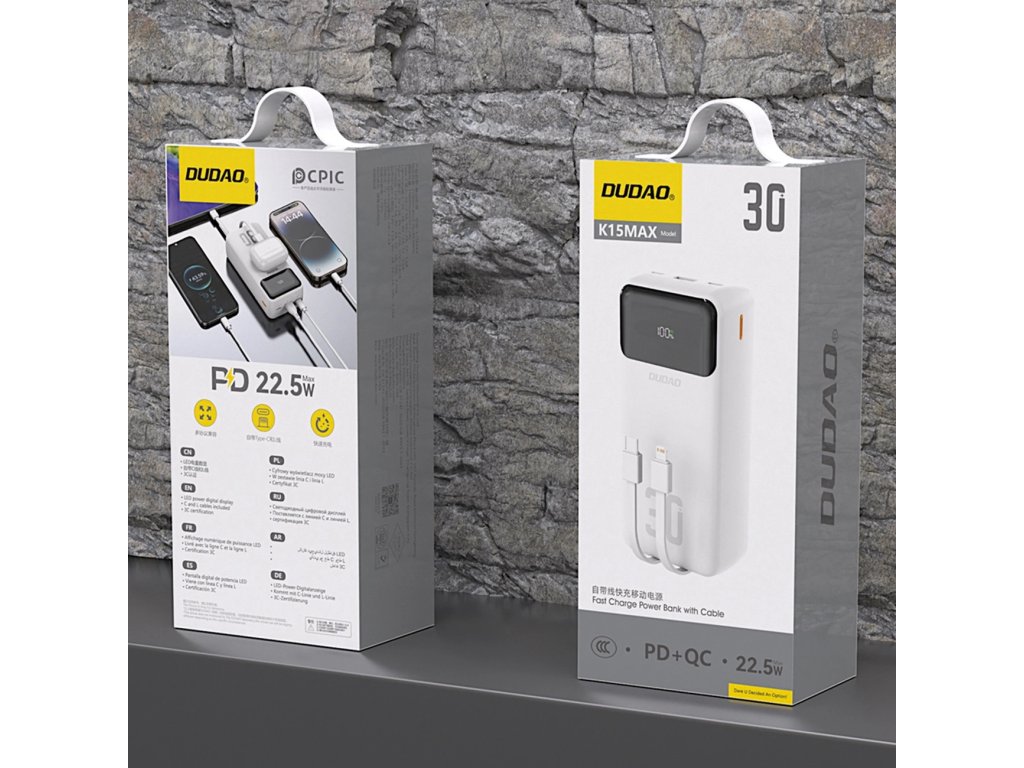 Powerbanka Dudao K15MAX 30 000 mAh je skutečným motorem mobilního nabíjení. Tato moderní powerbanka je vybavena technologií rychlého nabíjení PD a QC, díky čemuž je nenahraditelným společníkem na cesty, do práce nebo každodenní použití. Působivá kapacita 30000 mAh vám umožní nabíjet váš smartphone vícekrát. Odolná konstrukce, promyšlený design a bílá barva dodávají eleganci a funkčnost. Zařízení podporuje rychlé nabíjení až 22,5 W a nabíjení více zařízení současně. tato PowerBanka je perfektní řešení pro uživatele, kteří očekávají spolehlivost a vysokou účinnost.