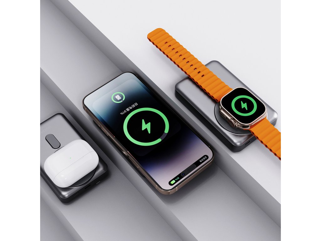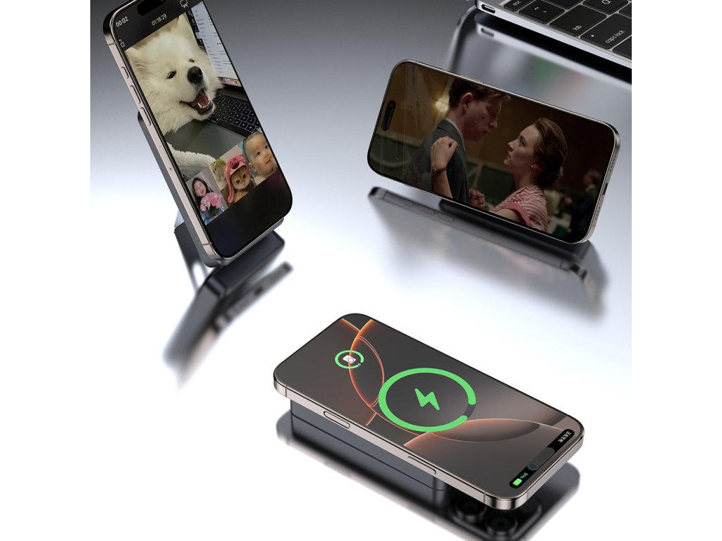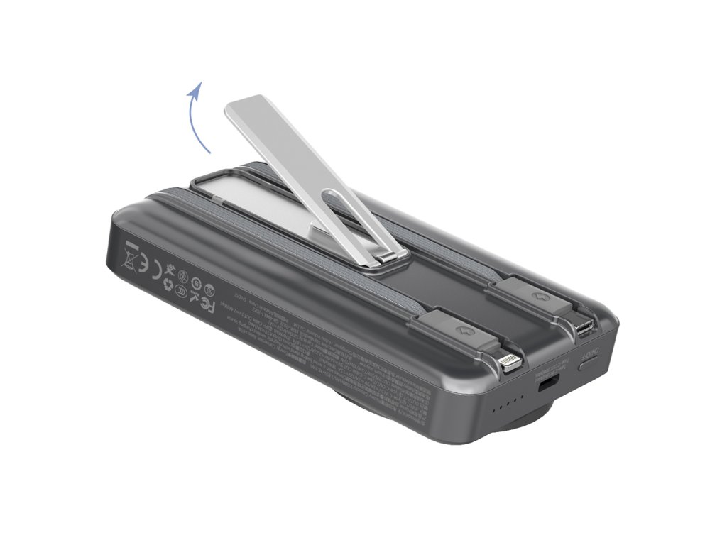 Powerbanka podporuje bezdrátové nabíjení až 15 W (MagSafe kompatibilní) a je vybavena výsuvným stojánkem, který umožňuje pohodlné používání telefonu ve vertikální i horizontální poloze během nabíjení. Ideální pro sledování videí, videohovory nebo práci na cestách.