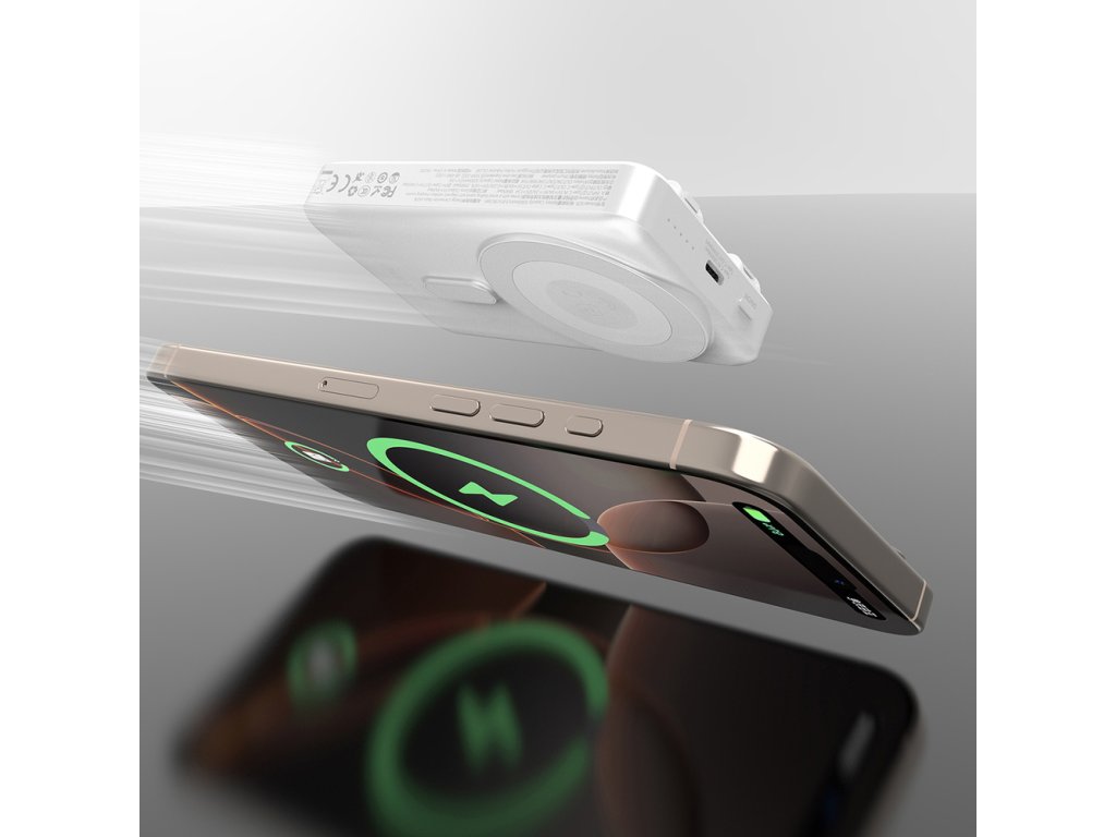 Powerbanka podporuje bezdrátové nabíjení až 15 W (MagSafe kompatibilní) a je vybavena výsuvným stojánkem, který umožňuje pohodlné používání telefonu ve vertikální i horizontální poloze během nabíjení. Ideální pro sledování videí, videohovory nebo práci na cestách.
