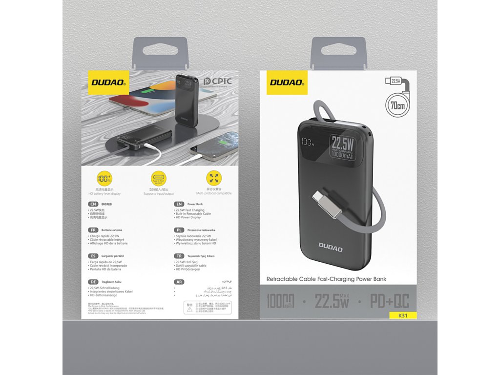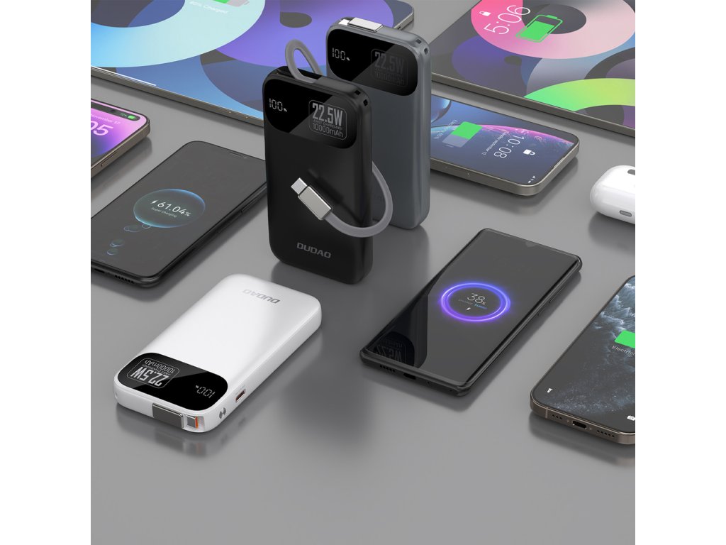 Dudao K31 je moderní powerbanka s kapacitou 10 000 mAh, která kombinuje elegantní design s výjimečnou funkčností. Díky rychlému nabíjení až 22,5 W a vestavěnému zatahovacímu 70cm kabelu USB-C poskytuje pohodlí a přenosnost v každé situaci. Je vybavena digitálním LED displejem, který zobrazuje úroveň nabití v reálném čase, zatímco inteligentní obvod chrání zařízení před zkratem, přebíjením a přehřátím.