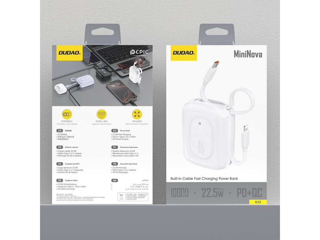 Dudao K32 PowerBanka 10000mAh / USB-C + vestavěný kabel USB-C a Apple / 22,5W / bílá