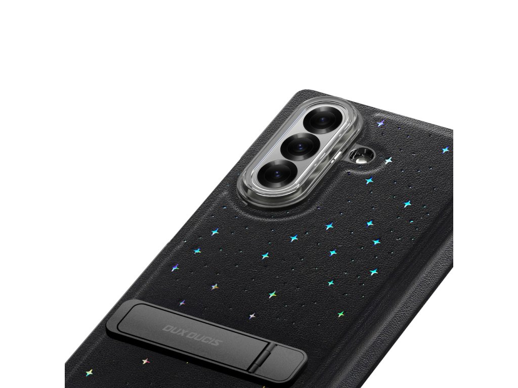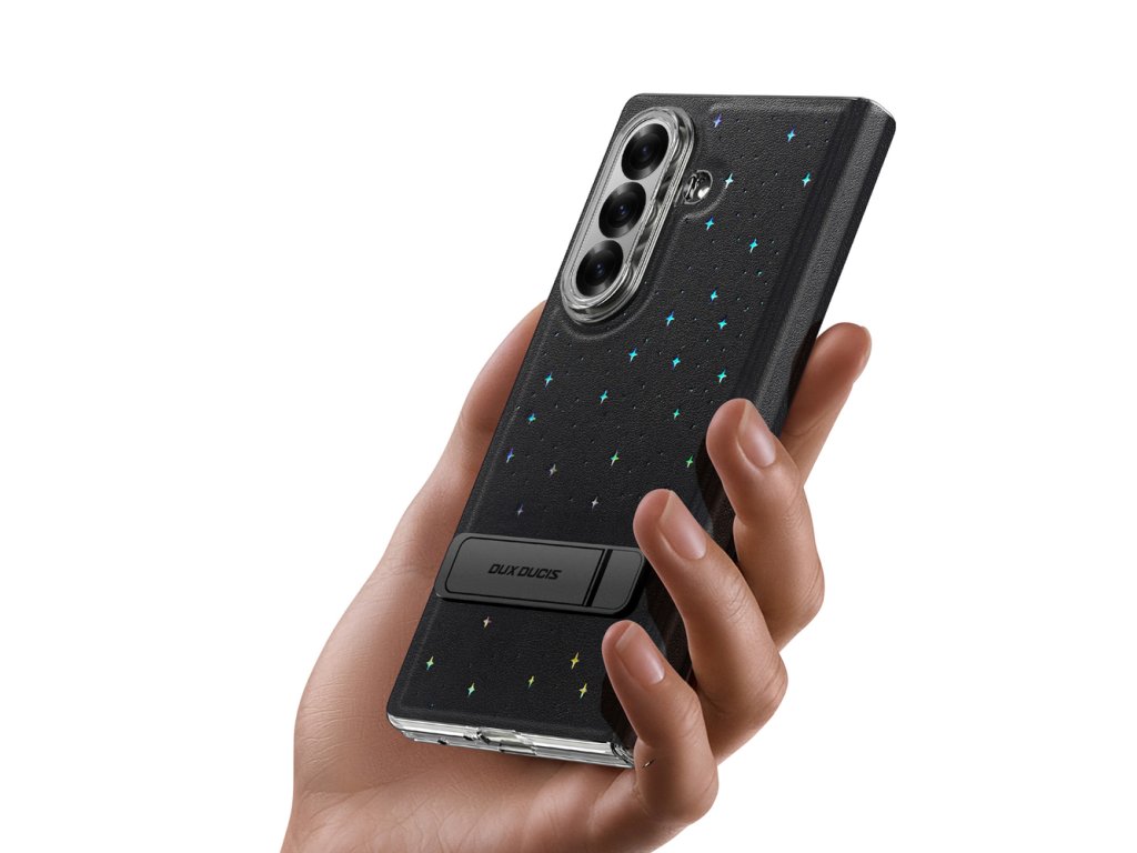 Pouzdro Dux Ducis Stex pro Samsung Galaxy Z Fold7 kombinuje pokročilou ochranu, eleganci a pohodlí. Integrovaný rám z tvrzeného skla chrání displej a hrany, zatímco vnitřní podšívka z mikrovlákna chrání zadní panel před poškrábáním. Magnetický design zajišťuje stabilitu při otevírání a zavírání a vestavěný stojánek umožňuje pohodlné sledování na výšku i na šířku. Luxusní texturovaná povrchová úprava z PU kůže a třpytivý motiv hvězdy vytvářejí výrazný vzhled.