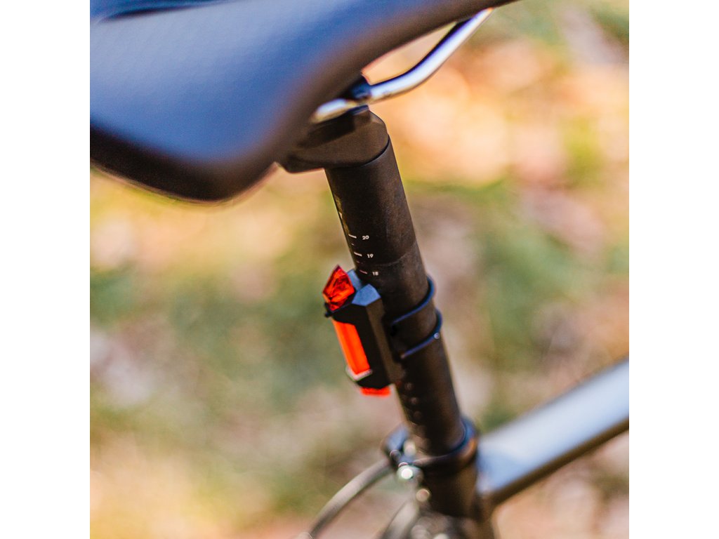 Zadní světlo: univerzální uchycení na sedlovku, červená barva světla, vestavěná baterie 150 mAh, jas 15 lumenů, nabíjení přes Micro USB, doba svícení až 6 hodin.
