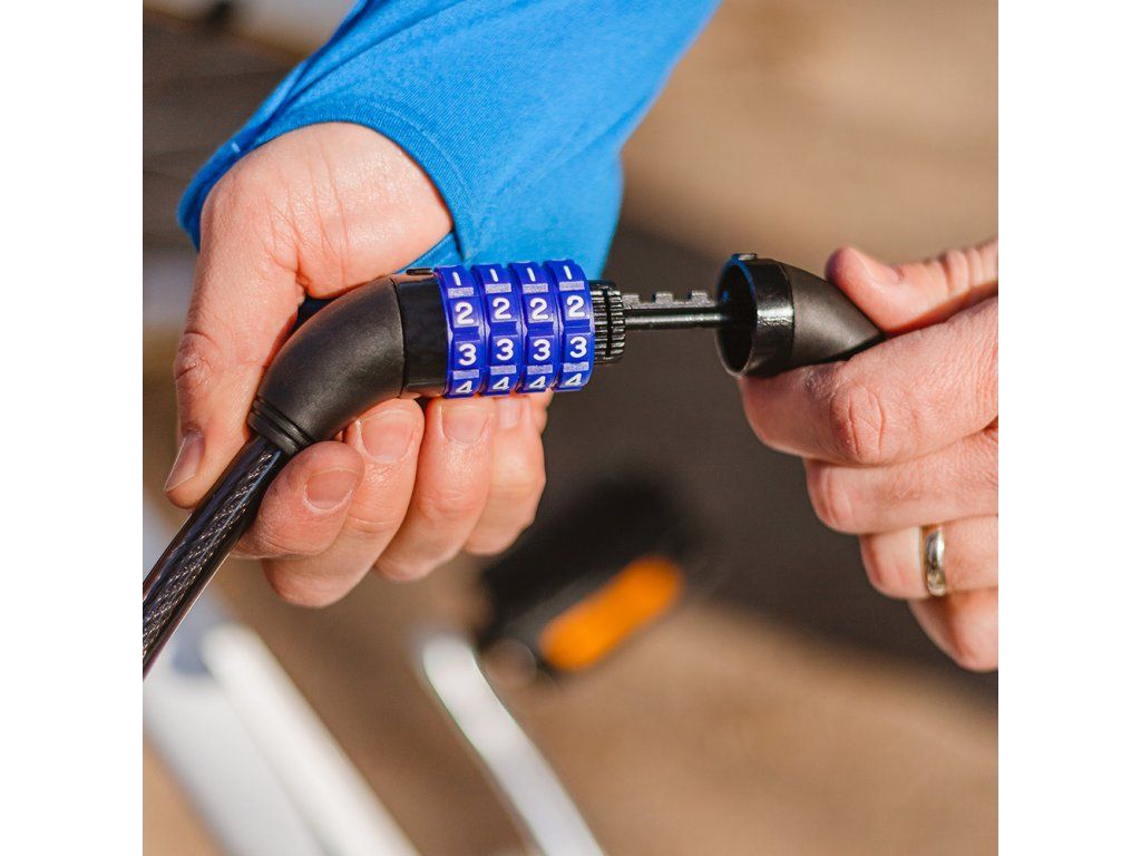 Zámek omotejte kolem rámu kola a pevného objektu, nastavte vlastní kód dle přiloženého návodu a zajistěte. Ideální pro krátkodobé parkování kola ve městě, u obchodu nebo ve škole.