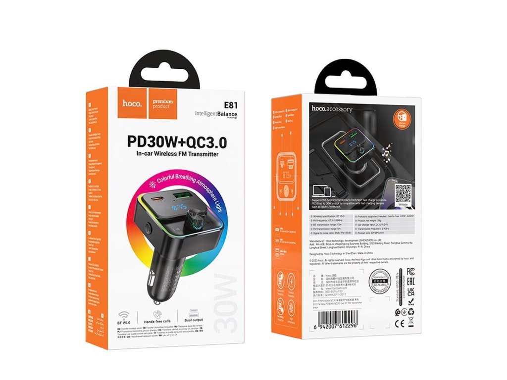 Hoco E81 / bluetooth FM transmitter / USB-C PD / USB-A / QC 3.0 / 30W