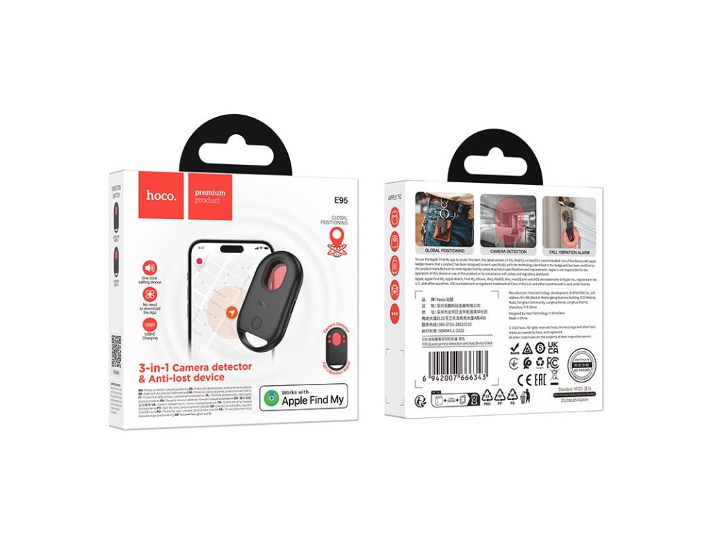 Lokalizátor HOCO E95 je kompaktní zařízení kompatibilní s Apple Find My, které kombinuje funkci lokalizátoru a detektoru kamer v jednom. Díky lehké konstrukci, solidním materiálům a pohodlné obsluze se ideálně hodí na cesty, do domácnosti i pro zabezpečení cenných předmětů.