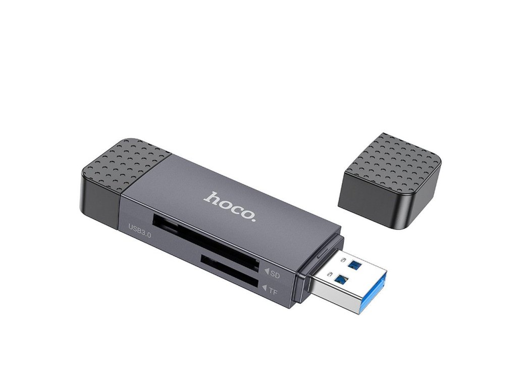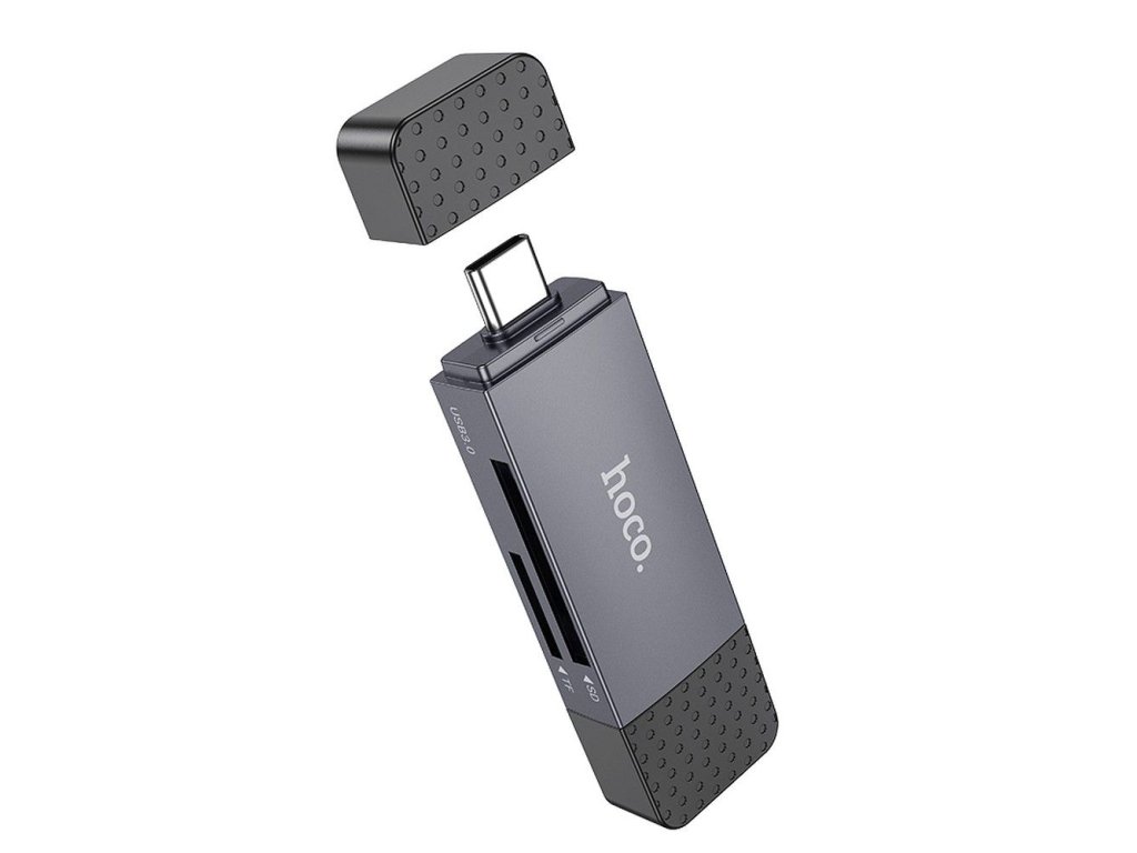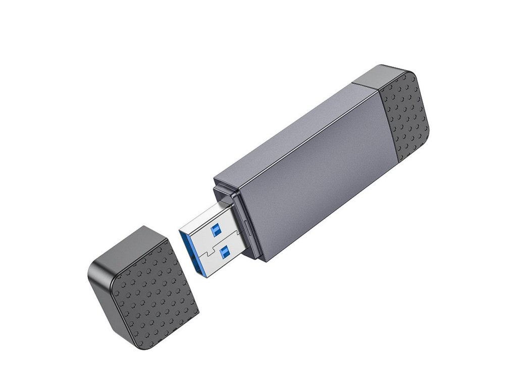 Čtečka paměťových karet 2 v 1 s konektorem USB-A / USB-C od společnosti Hoco. Podporuje SD a Micro SD karty