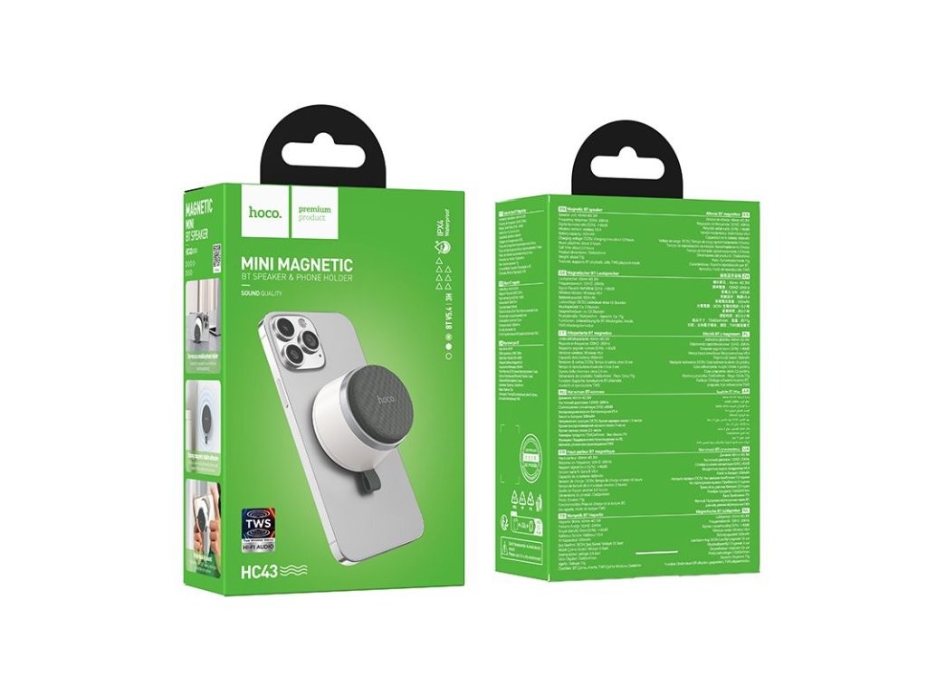 Hoco HC43 je vyroben z odolného plastu ABS s nylonovým potažením, což zajišťuje dobrou ochranu během každodenního používání. Vestavěný magnetický blok umožňuje stabilně připevnit reproduktor na kovové prvky, jako jsou police, regály nebo ocelové konstrukce, což zvyšuje pohodlí používání doma, v dílně nebo venku.