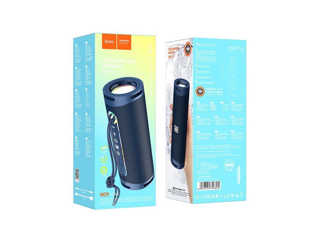 # Přenosný Bluetooth reproduktor Hoco HC9 je stylový přenosný bezdrátový reproduktor, který umožňuje připojení smartphonu a dalších audio zařízení vybavených funkcí Bluetooth. Vyniká vestavěným barevným ambientním osvětlením, které vytváří úžasnou atmosféru při poslechu hudby.