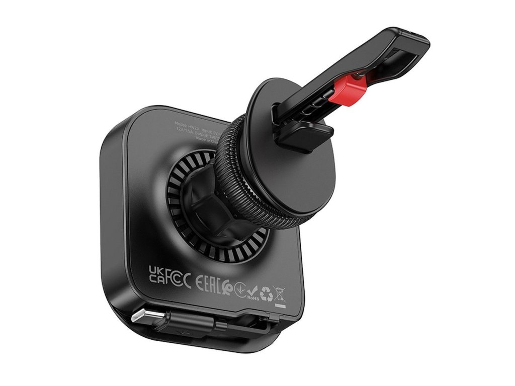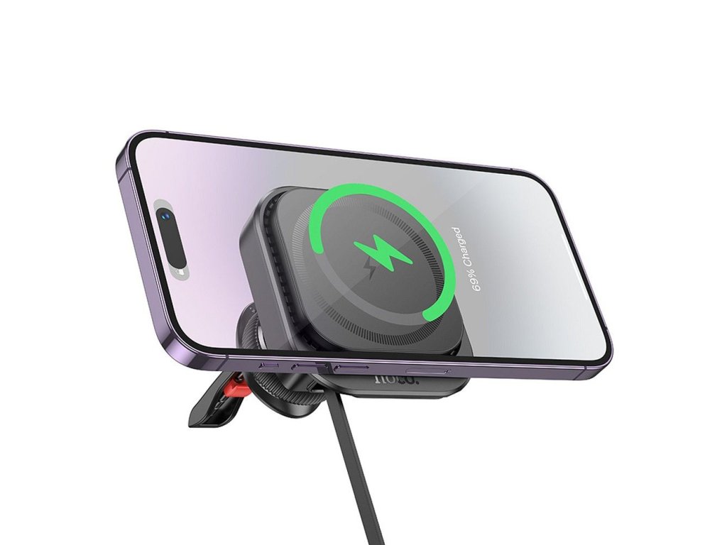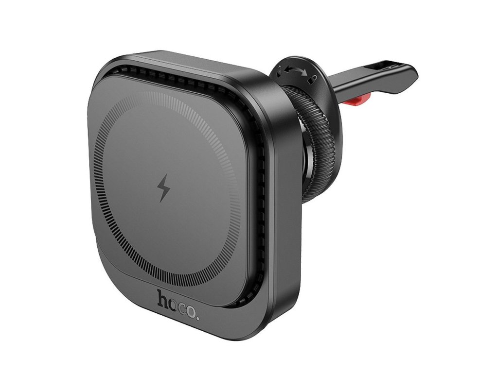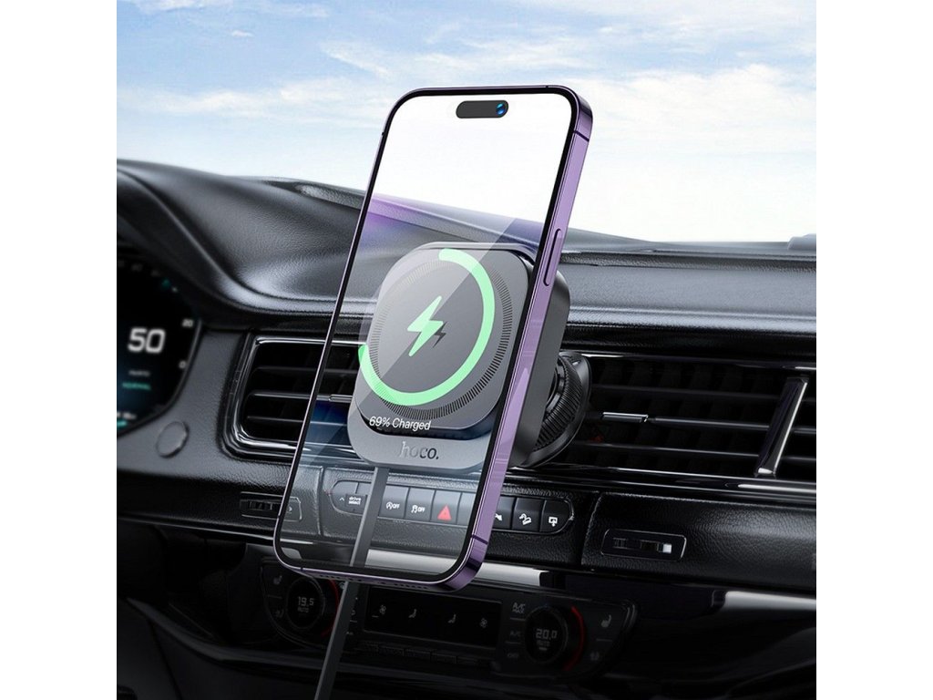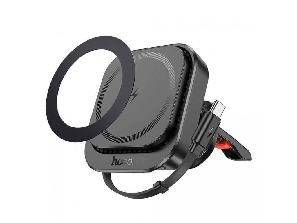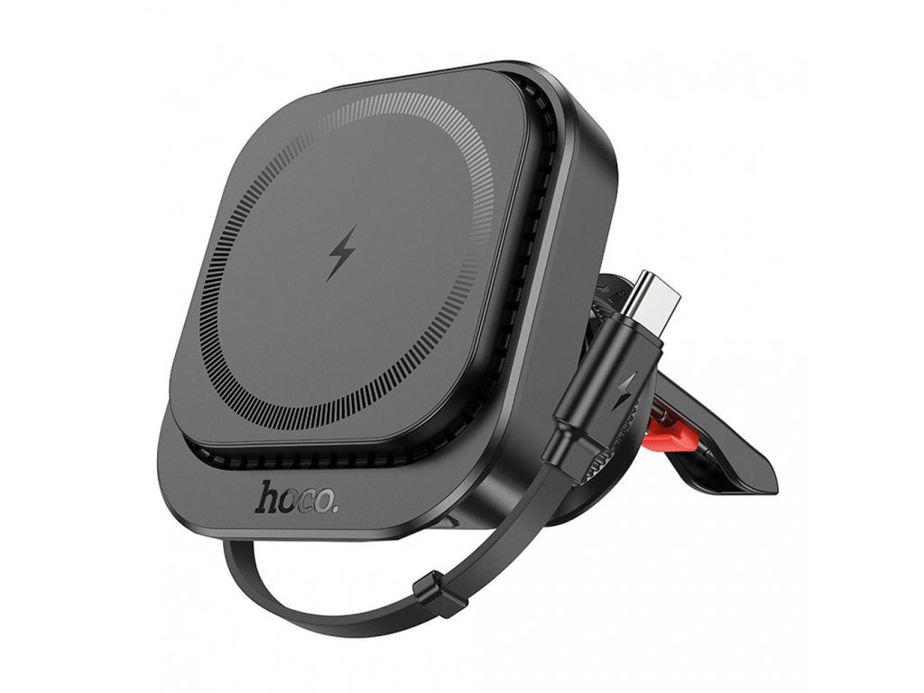Hoco držák do auta / do mřížky ventilátoru s bezdrátovým nabíjením s podporou MagSafe. Umožňuje bezpečně používat váš smartphone při řízení. Má vestavěný, navíjecí kabel s USB-C konektorem.