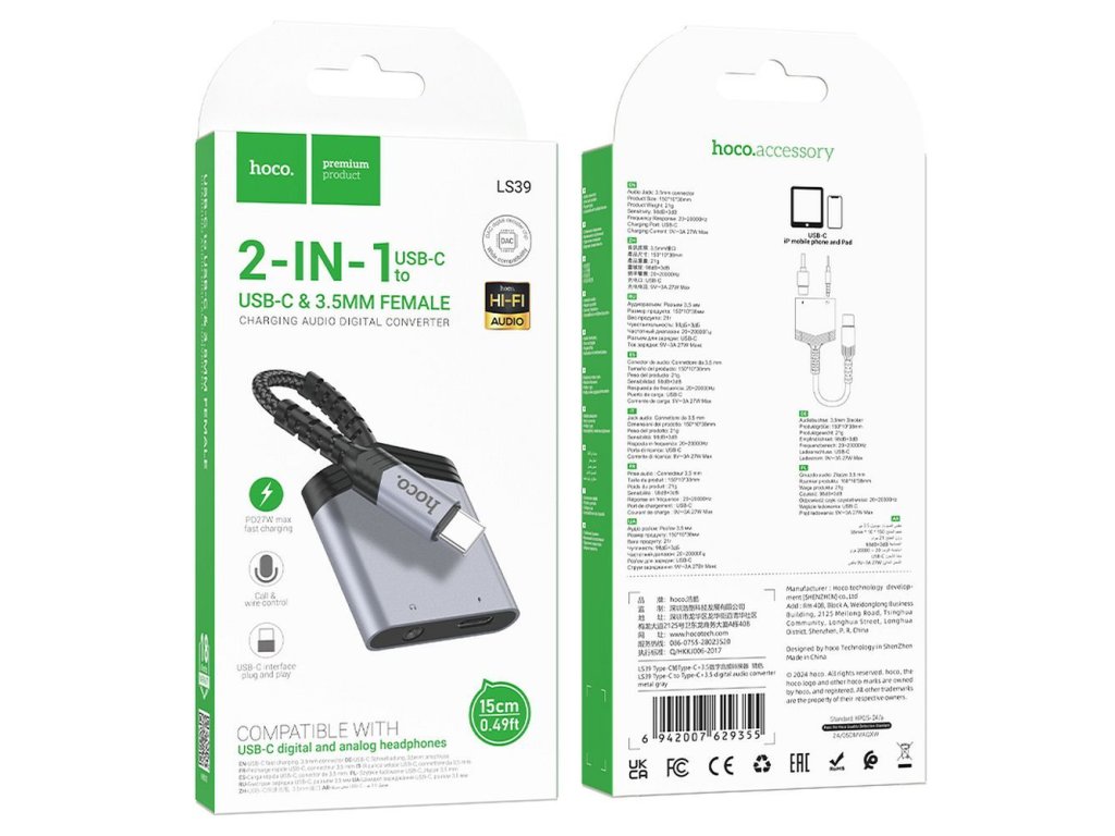 Hoco LS39 adaptér 2v1 USB-C / USB-C + 3,5mm jack / 27W / šedá