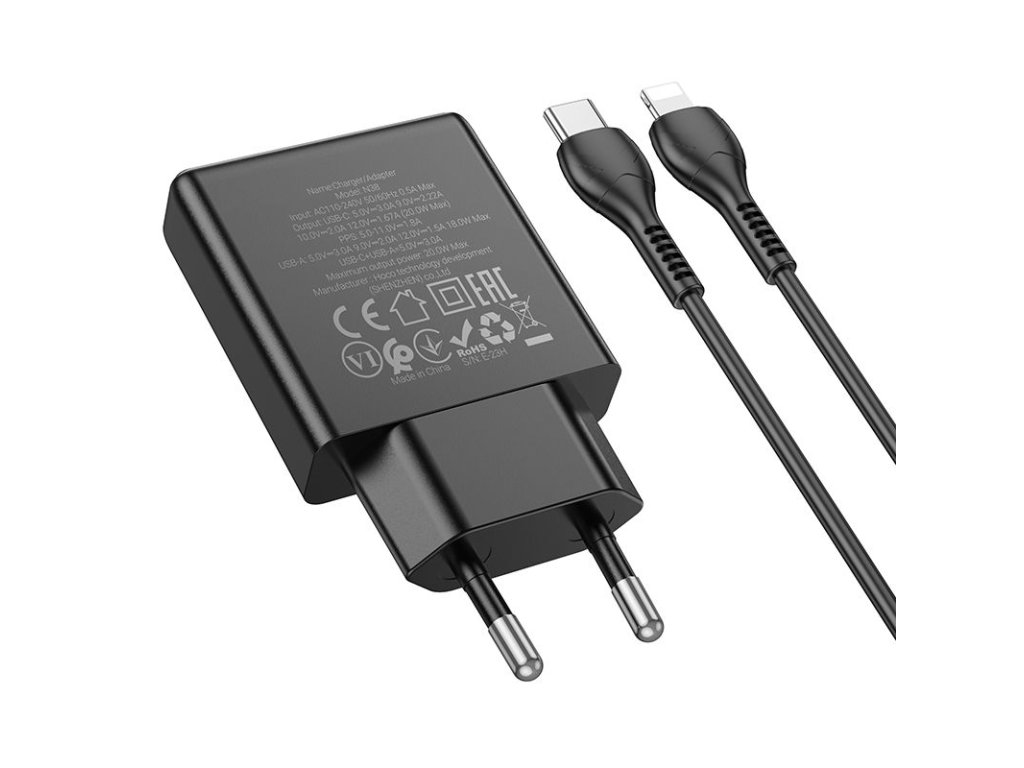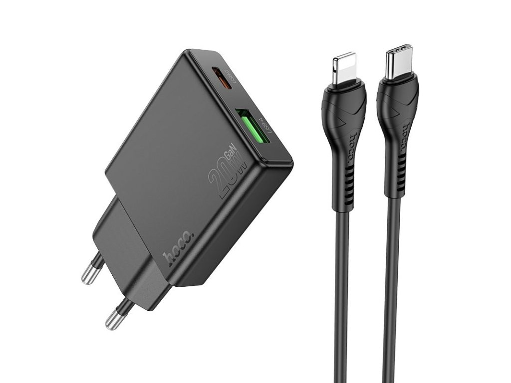 Hoco N38 nabíječka do sítě s výstupem USB-A + USB-C / 20W / kabel USB-C / Apple Lightning - černá.