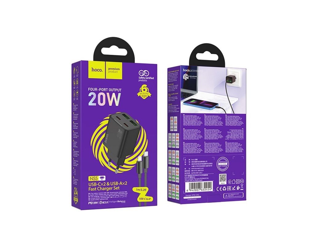 Hoco N55 nabíječka do sítě s výstupem 2x USB-C, 2x USB-A, 20W kabel USB-C / Apple černá