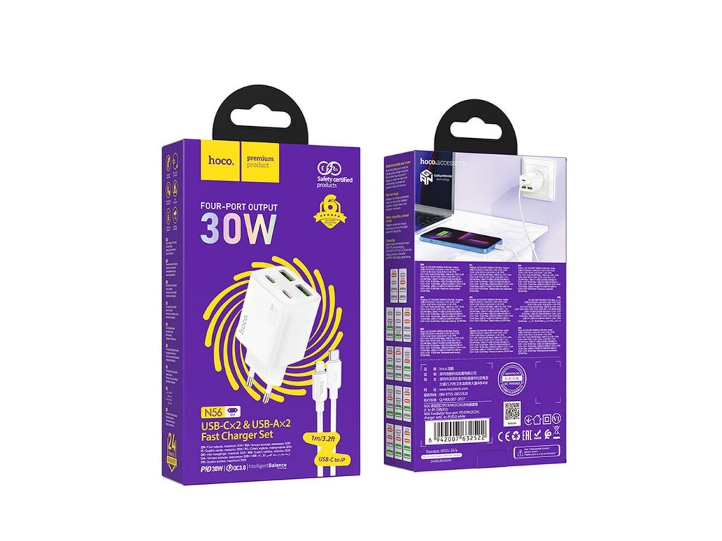 Síťová nabíječka HOCO N56 je výkonné a praktické řešení pro rychlé nabíjení více mobilních zařízení současně. Díky čtveřici výstupů - 2× USB-C a 2× USB-A – umožňuje nabíjet až 4 zařízení najednou, což je ideální pro domácnost, kancelář i cestování.
