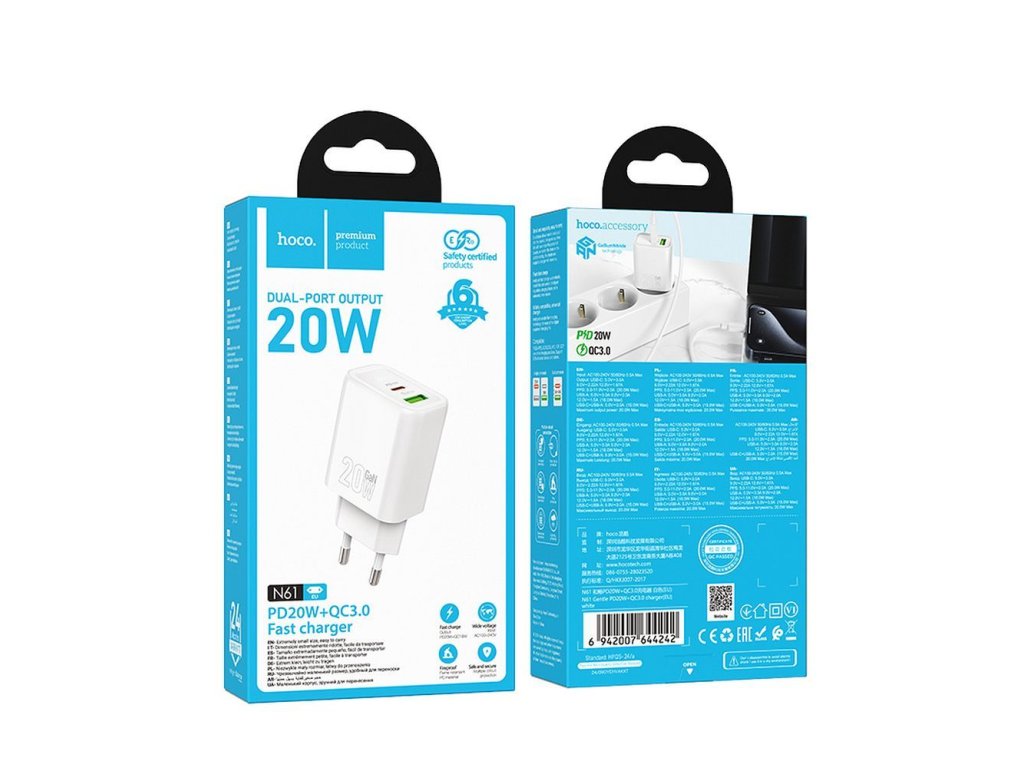Síťová nabíječka Hoco N61 nabízí rychlost a bezpečnost při nabíjení, nejen, že splňuje nejnovější požadavky na napájení, ale také nabízí univerzální kompatibilitu s různými zařízeními. Díky podpoře protokolů Power Delivery, Quick Charge 3.0, AFc a FCP si můžete užívat extrémně rychlé nabíjení, až čtyřikrát rychlejší než u standardní nabíječky. Šestibodová ochrana navíc zajišťuje úplnou bezpečnost vašich zařízení.