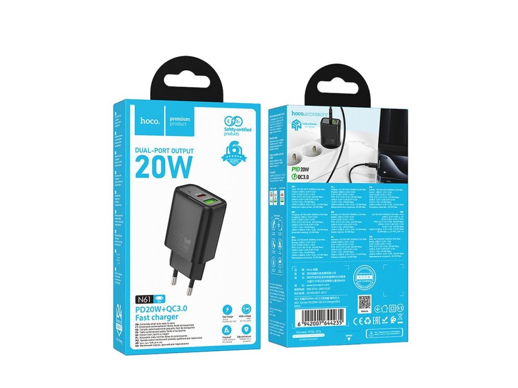 Síťová nabíječka Hoco N61 nabízí rychlost a bezpečnost při nabíjení, nejen, že splňuje nejnovější požadavky na napájení, ale také nabízí univerzální kompatibilitu s různými zařízeními. Díky podpoře protokolů Power Delivery, Quick Charge 3.0, AFc a FCP si můžete užívat extrémně rychlé nabíjení, až čtyřikrát rychlejší než u standardní nabíječky. Šestibodová ochrana navíc zajišťuje úplnou bezpečnost vašich zařízení.