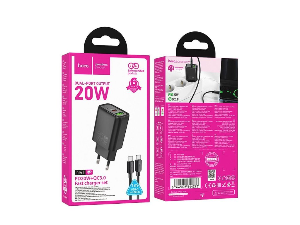 Síťová nabíječka Hoco N61 nabízí rychlost a bezpečnost při nabíjení, nejen, že splňuje nejnovější požadavky na napájení, ale také nabízí univerzální kompatibilitu s různými zařízeními. Díky podpoře protokolů Power Delivery, Quick Charge 3.0, AFc a FCP si můžete užívat extrémně rychlé nabíjení, až čtyřikrát rychlejší než u standardní nabíječky. Šestibodová ochrana navíc zajišťuje úplnou bezpečnost vašich zařízení.