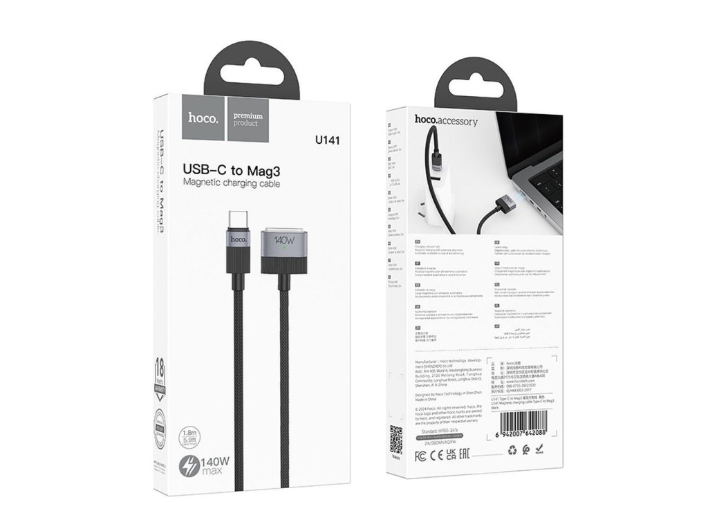 Hoco U141 USB-C kabel / Mag3 / 1,8m / 5A / 140W - černý.
