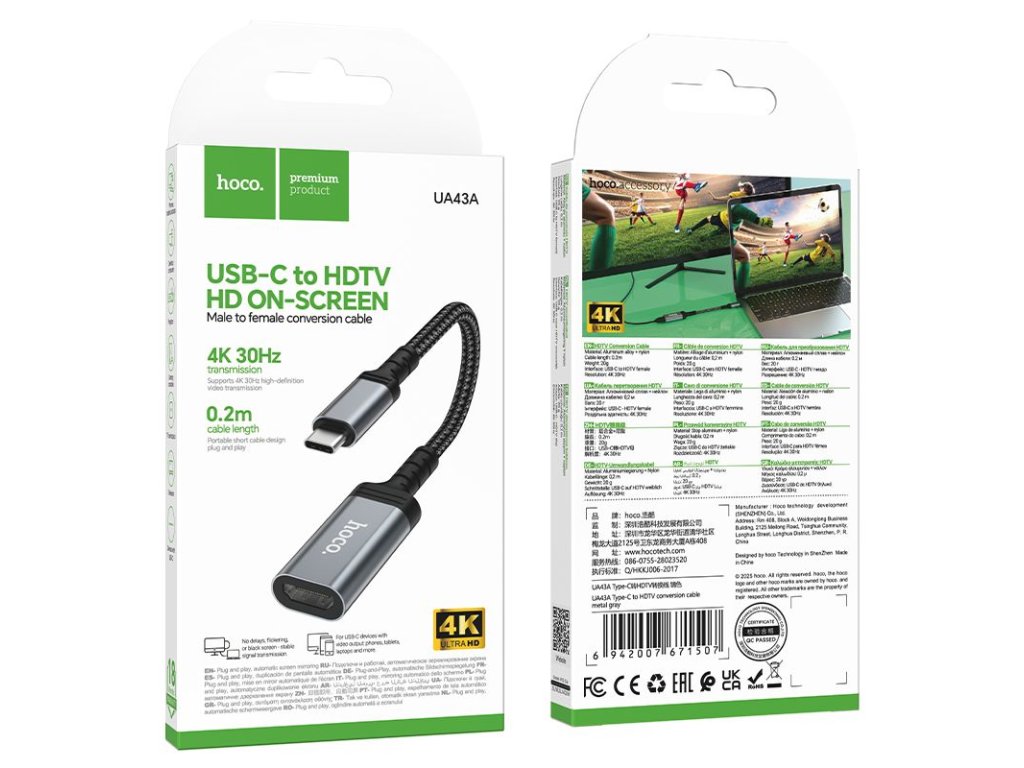 Adaptér HOCO UA43A je kompaktní a výkonné řešení, které umožňuje rychlé a snadné připojení notebooku, tabletu nebo chytrého telefonu s portem USB-C k monitoru, televizoru nebo projektoru. Podpora rozlišení 4K při 30 Hz zajišťuje ostrý, detailní a stabilní obraz. Díky krátké délce kabelu 20 cm je adaptér ideální jak pro domácí použití, tak i na cesty.