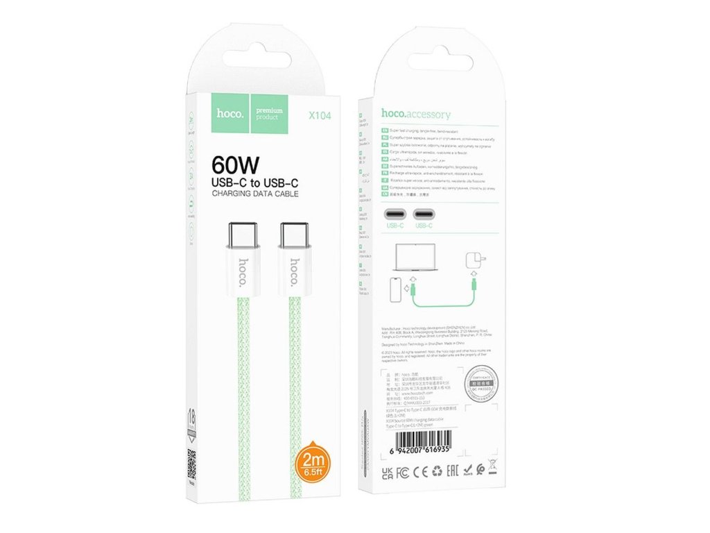 Hoco X104 kabel USB-C PD - USB-C / 2m / 60W - bílá / zelená.