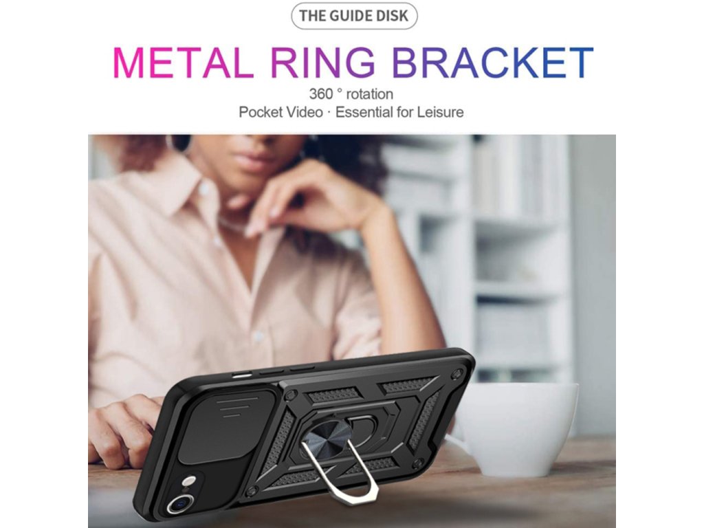 Zvýšené okraje kolem displeje jej chrání před poškrábáním při položení na rovný povrch. Kryt má zabudovaný kovový kroužek, který umožňuje pohodlné používání telefonu jednou rukou a funguje také jako stojánek. Vestavěná kovová deska umožňuje připevnění k magnetickým držákům, funguje jako protikus.