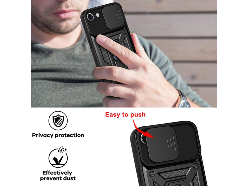 Pouzdro Hybrid Armor Camshield je vyrobeno z termoplastického a odolného materiálu. Kryt dokonale chrání telefon před poškozením pádem nebo poškrábáním, má posuvný kryt pro zadní fotoaparát, díky němu je sklo kamery chráněno.