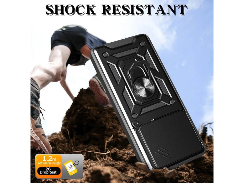 Pouzdro Hybrid Armor Camshield je vyrobeno z termoplastického a odolného materiálu. Kryt dokonale chrání telefon před poškozením pádem nebo poškrábáním, má posuvný kryt pro zadní fotoaparát, díky němu je sklo kamery chráněno.