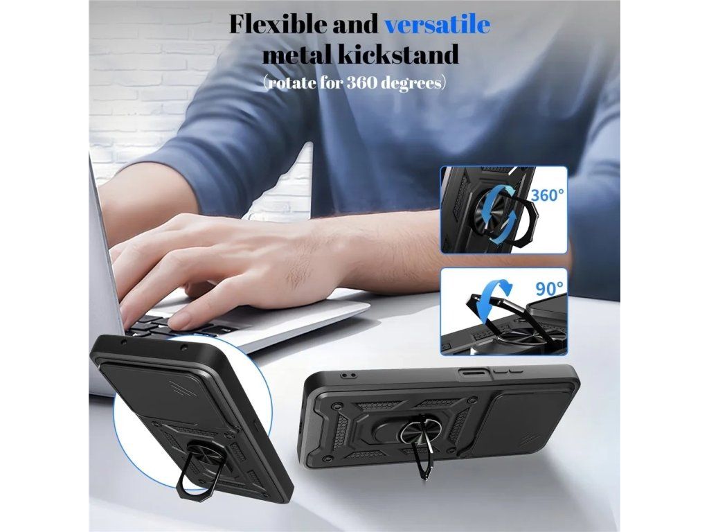 Pouzdro se nasazuje na zadní část telefonu a pevně jej obepíná. Posuvný kryt chrání fotoaparát, zatímco integrovaný kroužek zvyšuje komfort držení a umožňuje využití jako stojánek.