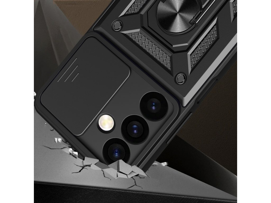 Pouzdro Hybrid Armor Camshield je vyrobeno z termoplastického a odolného materiálu. Kryt dokonale chrání telefon před poškozením pádem nebo poškrábáním, má posuvný kryt pro zadní fotoaparát, díky němu je sklo kamery chráněno.