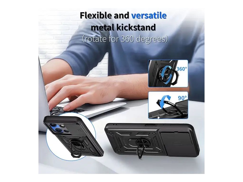 Pouzdro Hybrid Armor Camshield je vyrobeno z termoplastického a odolného materiálu. Kryt dokonale chrání telefon před poškozením pádem nebo poškrábáním, má posuvný kryt pro zadní fotoaparát, díky němu je sklo kamery chráněno.