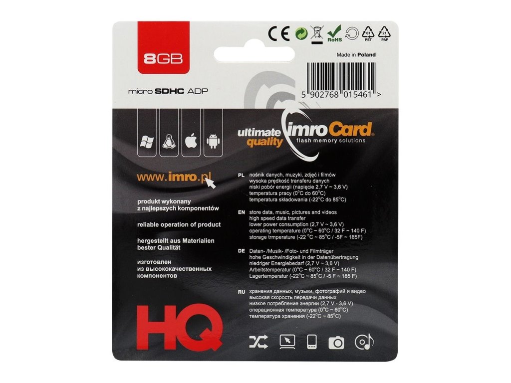 Karta IMRO od známého výrobce je komponována z vysoce kvalitních materiálů, které zajišťují stabilní výkon a dlouhou životnost. Rychlá přenosová rychlost umožňuje plynulé ukládání i přehrávání souborů, včetně videí ve vysokém rozlišení. Bez problémů si poradí s náročnějšími daty a poskytuje jistotu bezpečného uchování vašich souborů.
